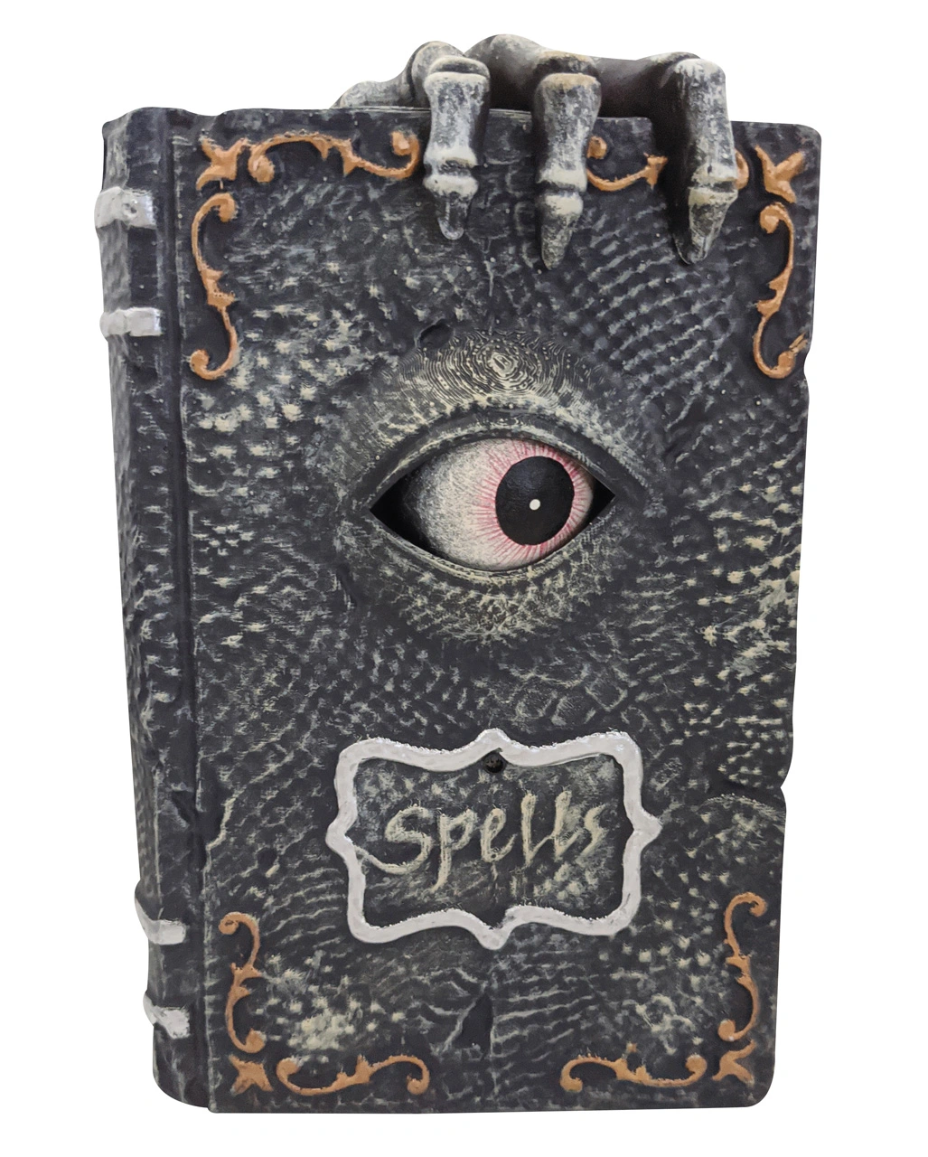 Unser animiertes Hexenbuch mit Drachenauge sorgt für Gänsehaut. Lege die schaurige Halloween Tischdekoration so hin, dass sie jeder sehen kann. Das unheimliche Aussehen des Zauberbuches wird dafür sorgen, dass man sich neugierig nähert. Nicht ahnend, dass man es mit einem absoluten Grusel Highlight zu tun bekommen. Das Buch muss verzaubert sein. Das Auge leuchtet und bewegt sich in dem Buch. Wie kann das möglich sein. Und dann diese grausigen Geräusche. So mancher spitze Schrei des Schreckens wird an diesem Abend ertönen. Gönne dir diesen Gruselspaß und bringe deine Freunde mit diesem originellen Halloween Animatronic ins Schwitzen.