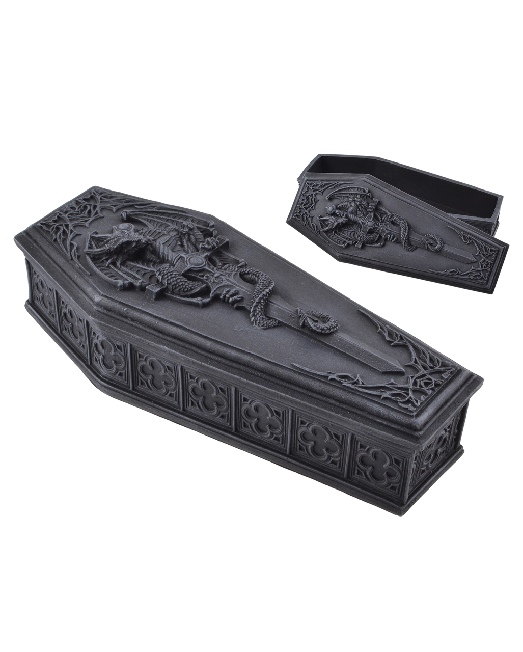 Der Drachensarg Box mit Deckel ist perfekt für alle, die ihrer alternativen Einrichtung einen mystischen Touch verleihen möchten. Das Schwert des Drachenkämpfers ziert diese fantasievoll gestaltete Box, in der du Schmuck, Krimskrams oder deine Sammunlung an Lippenstiften aufbewahren kannst. Die mystische Sarg Schatulle verbirgt alle deine Schätze hinter einer ziemlich dekorativen Hülle. Schließlich ist das Kästchen selbst ein echtes Schmuckstück und ein Paradebeispiel für echte Gothic Kunst.