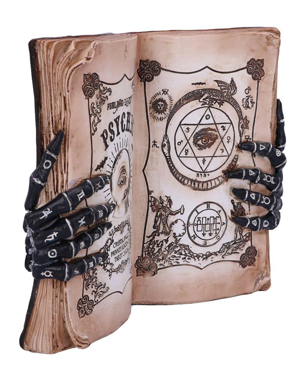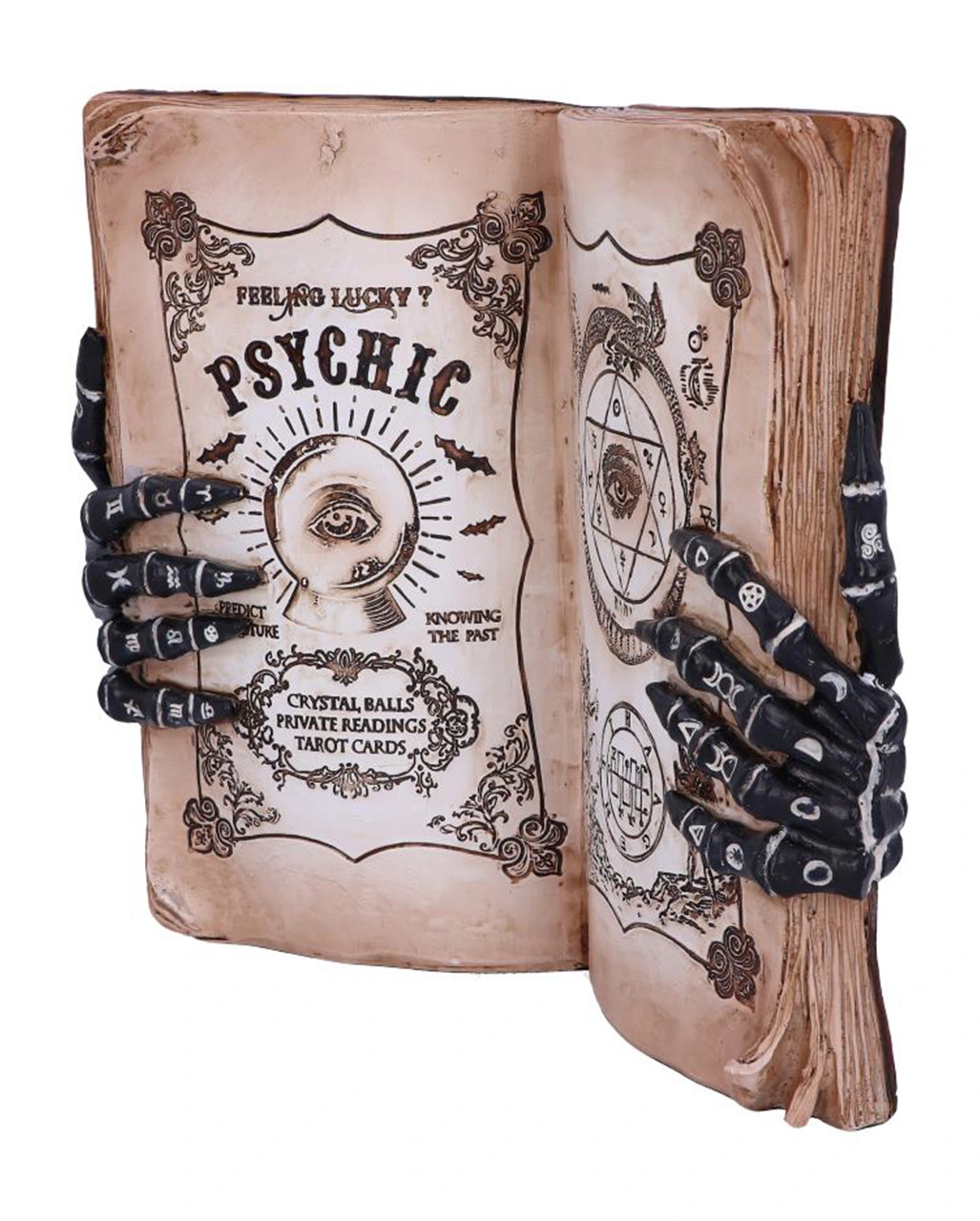 Die Chiromantie, auch Handlesekunst genannt, basiert auf dem Glauben, dass sich der Charakter und die Zukunft eines Menschen aus seiner Handfläche ablesen lassen. Unsere Hellseher Zauberbuch Deko ist an die Chiromantie angelehnt, denn das Buch wird von Skeletthänden mit mystischen Symbolen gehalten.