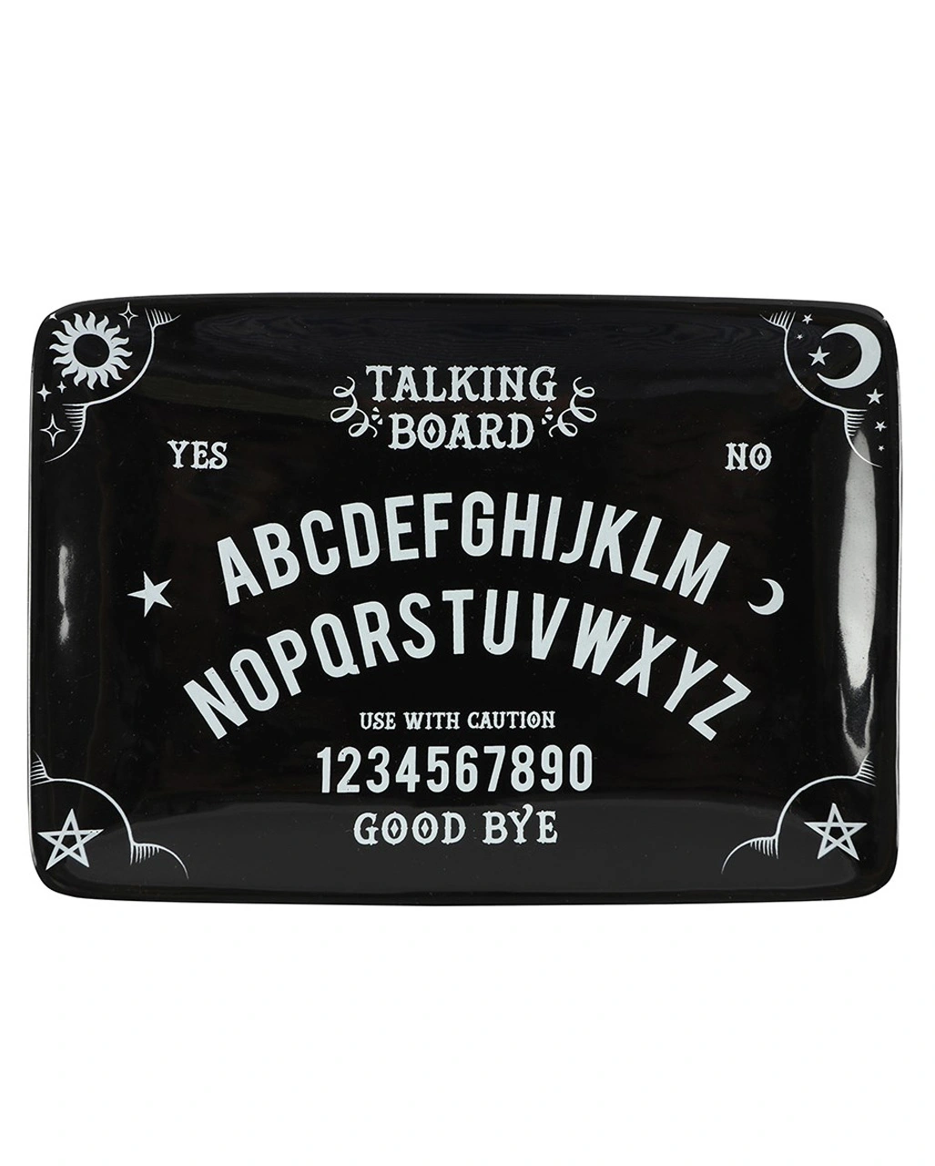 Die Schwarze Hexenbrett Keramik Schmuckschale ist eine Gothic Deko mit Wow-Effekt. Sie ist etwa 17 c 12,5 cm groß und relativ flach. Optisch ist unsere okkulte Keramik-Schmuckschale von einem klassischen Ouija Board inspiriert. Sie trägt alle nötigen Buchstaben und Zahlen auf sich und ist mit Mondsicheln, Sternen und Pentagramm verziert. Damit ist sie die perfekte Ablage für den Schmuck der Hexe und andere kleine Accessoires.