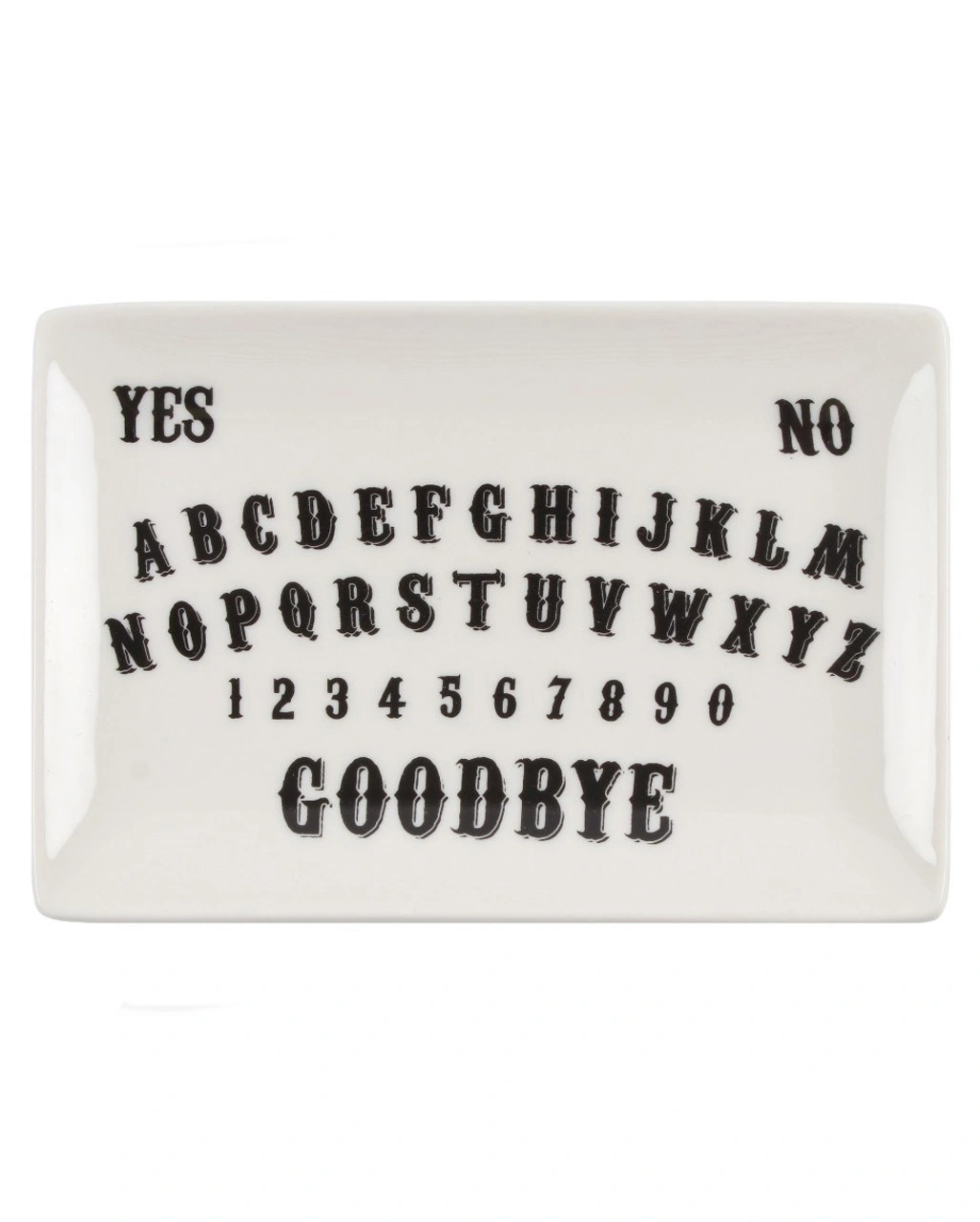 Dein weißes Spirit Board als Schmuckschale eignet sich super, um Krimskrams ordentlich aufzubewahren. Als Gothic Schmuckschale kommt sie ganz klassisch mit den Ziffern 0 bis 9, dem Alphabet sowie den Worten YES, NO und GOODBYE. Entdecke noch mehr coole Gothic Wohnaccessoires wie unsere Hexenbrett Türmatte oder die Hexenbrett Tagesdecke.